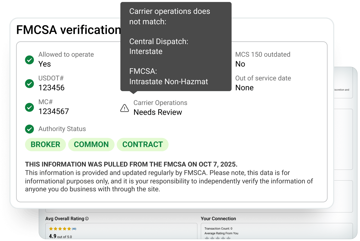 Make more confident partnering decisions with easy access to every carrier’s USDOT#, MC# (if applicable), and Authority Status available on their public profile.
