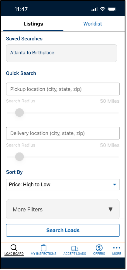 - From the Listings tab, find loads by selecting a saved search, adding filters, or simply by clicking Search Loads.