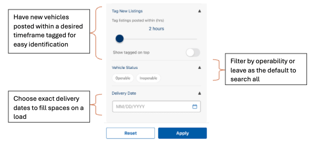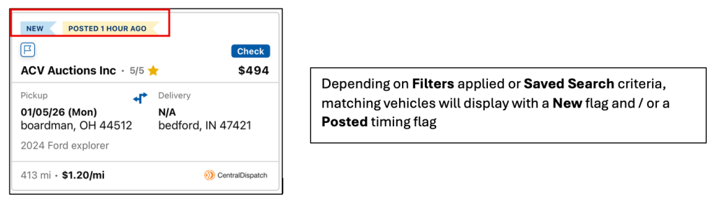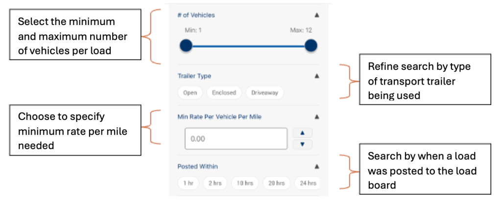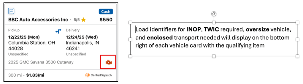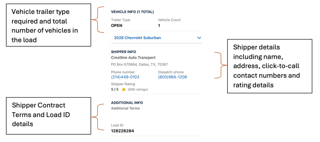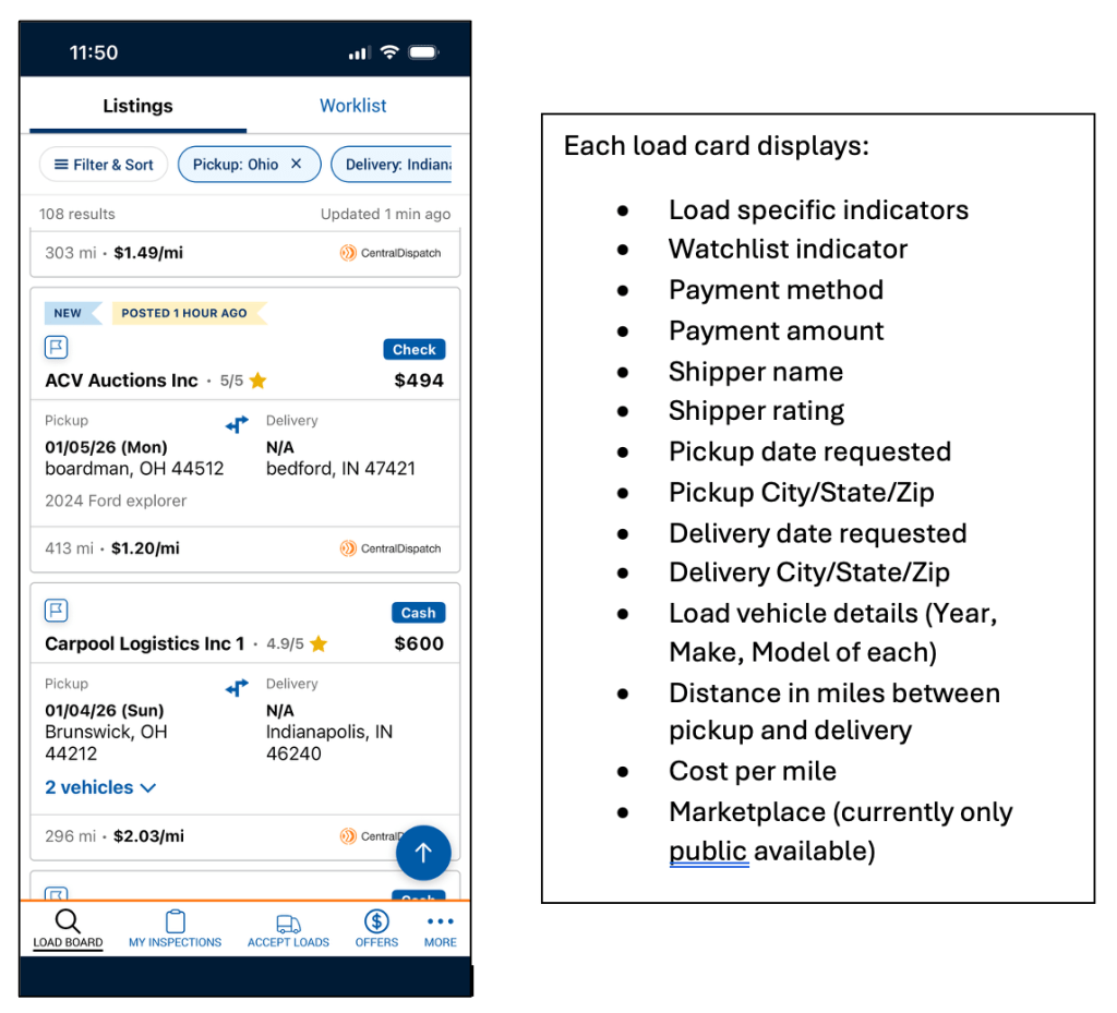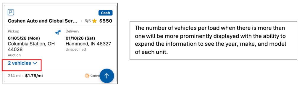 - Each vehicle card will display similar information to the web version including the pickup and delivery location details, the payment amount and method, shipper rating, and the vehicles per load.