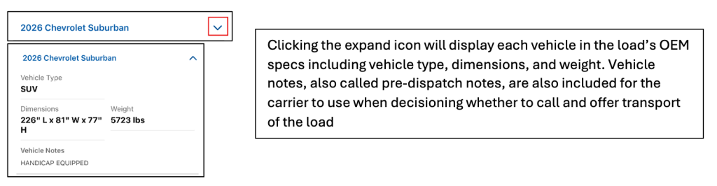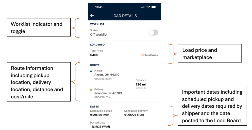 When a carrier clicks into the load card, the additional details display for that load.