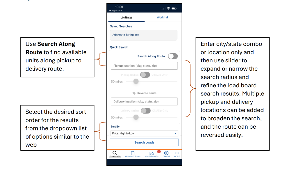 Search for loads with a specific origin and destination, look along your preferred routes, and enjoy all the same filters available in your desktop workflow. Learn more about searching for loads in the app here.