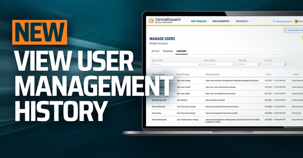 Central Dispatch Owners and Admins can now access additional transparency when it comes to User Management. A new “History” tab is now available to provide visibility into user profile modifications. This includes changes like new users added or invited, deleted profiles, or changes made to a user’s role or information.